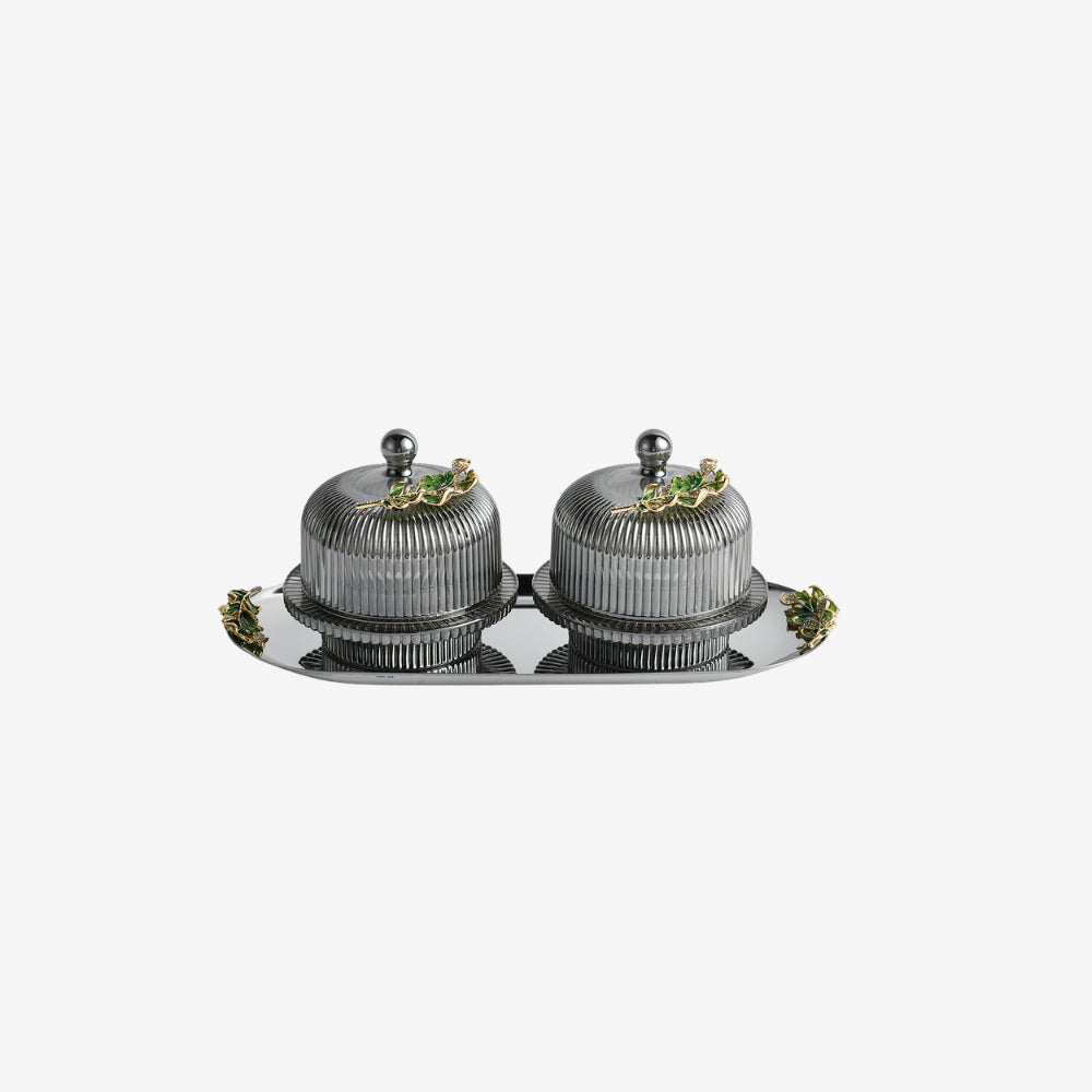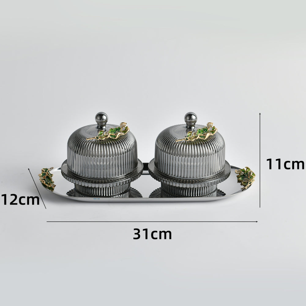 Introduce a bold and contemporary edge to your dining and décor with the Noir Dome Twin Serving Set. Featuring sleek ribbed glass domes paired with a reflective metallic tray, this piece blends modern sophistication with functional elegance.