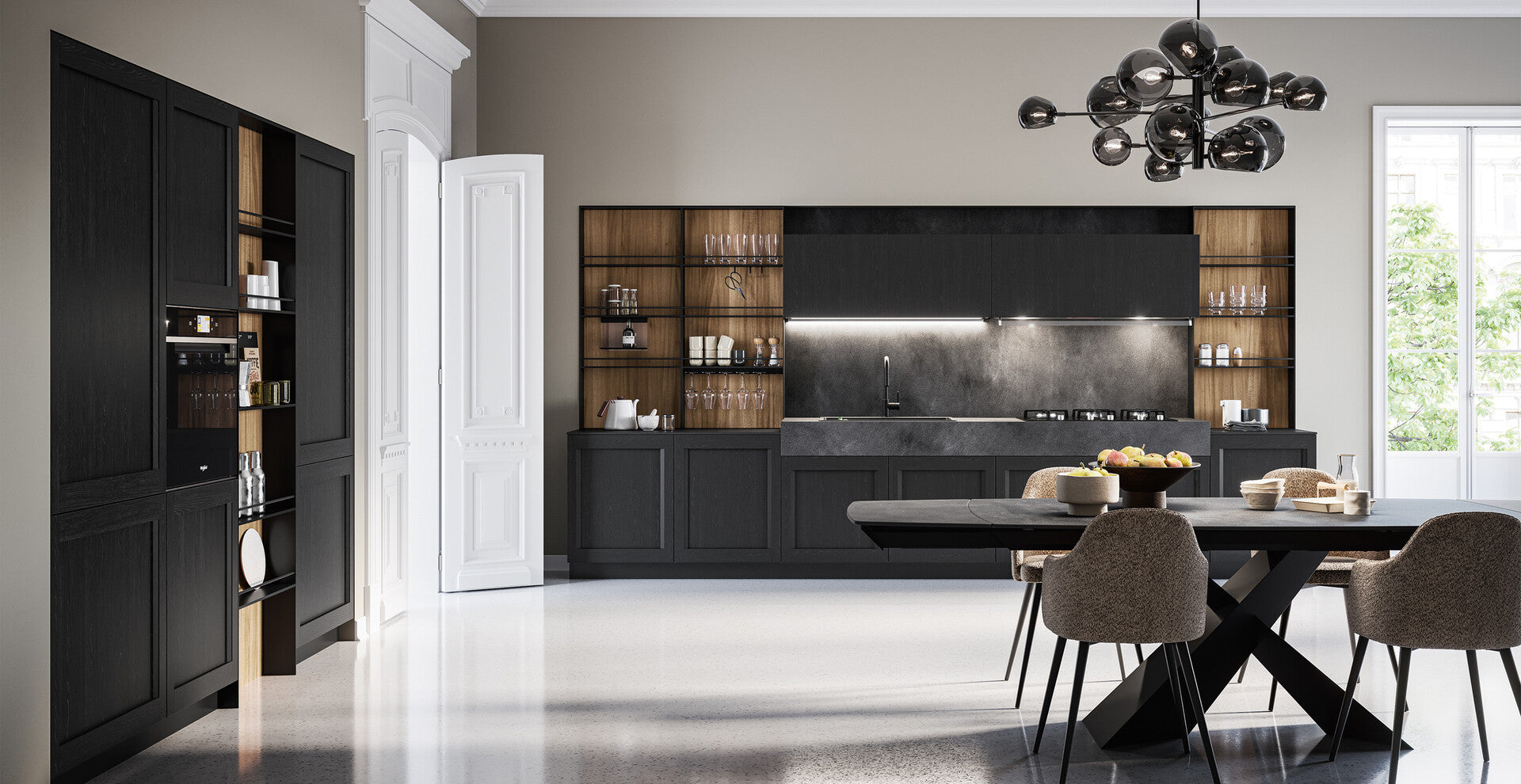 It will be a contemporary kitchen in an open-pore brandy finish with visible veins or in sober matt lacquered chalk and hay colours, always open port, or, again, in fresher and even livelier lacquered shades in a range of 33 options.