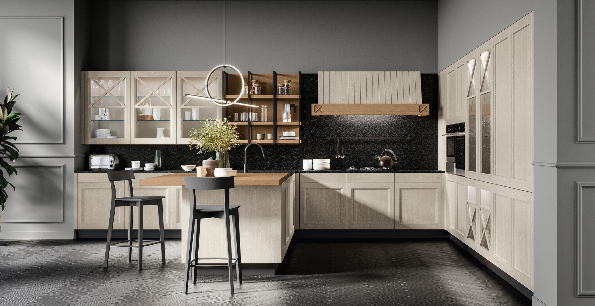 You can compose Frida as you like according to your taste and make it a contemporary and very current kitchen, perfectly in line with your needs. At your disposal 33 open-pore lacquered colours, i.e. with visible grain, two with a pickled finish and a classic choice, the brandy finish for that touch of wood that warms the heart and immediately gives the feeling of warmth in any kitchen. Frida's solid ash framed door is also available on request in a transparent glass version and possibly with wooden decoration for a more classic taste.