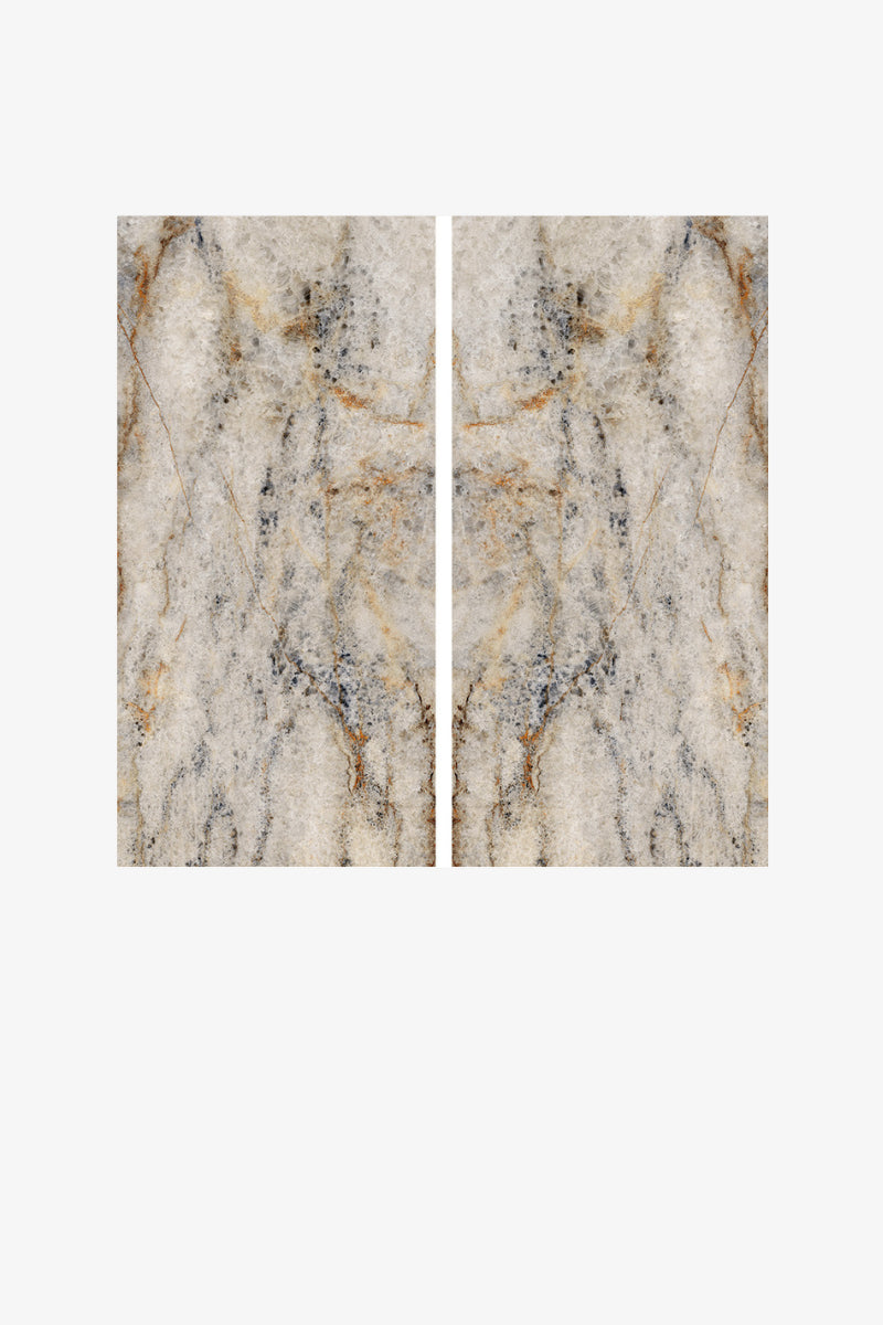 Embrace the subtle sophistication of Quarzo Avorio. This beautiful slab features a warm, inviting ivory base, reminiscent of natural quartz, with delicate, flowing veining. The bookmatch design opens up this gentle pattern into a perfectly symmetrical and continuous canvas, creating a sense of serene, balanced beauty. Finished with a high-gloss polish, its luminous surface enhances the soft, creamy tones, bringing a bright, timeless, and understated luxury to any interior.