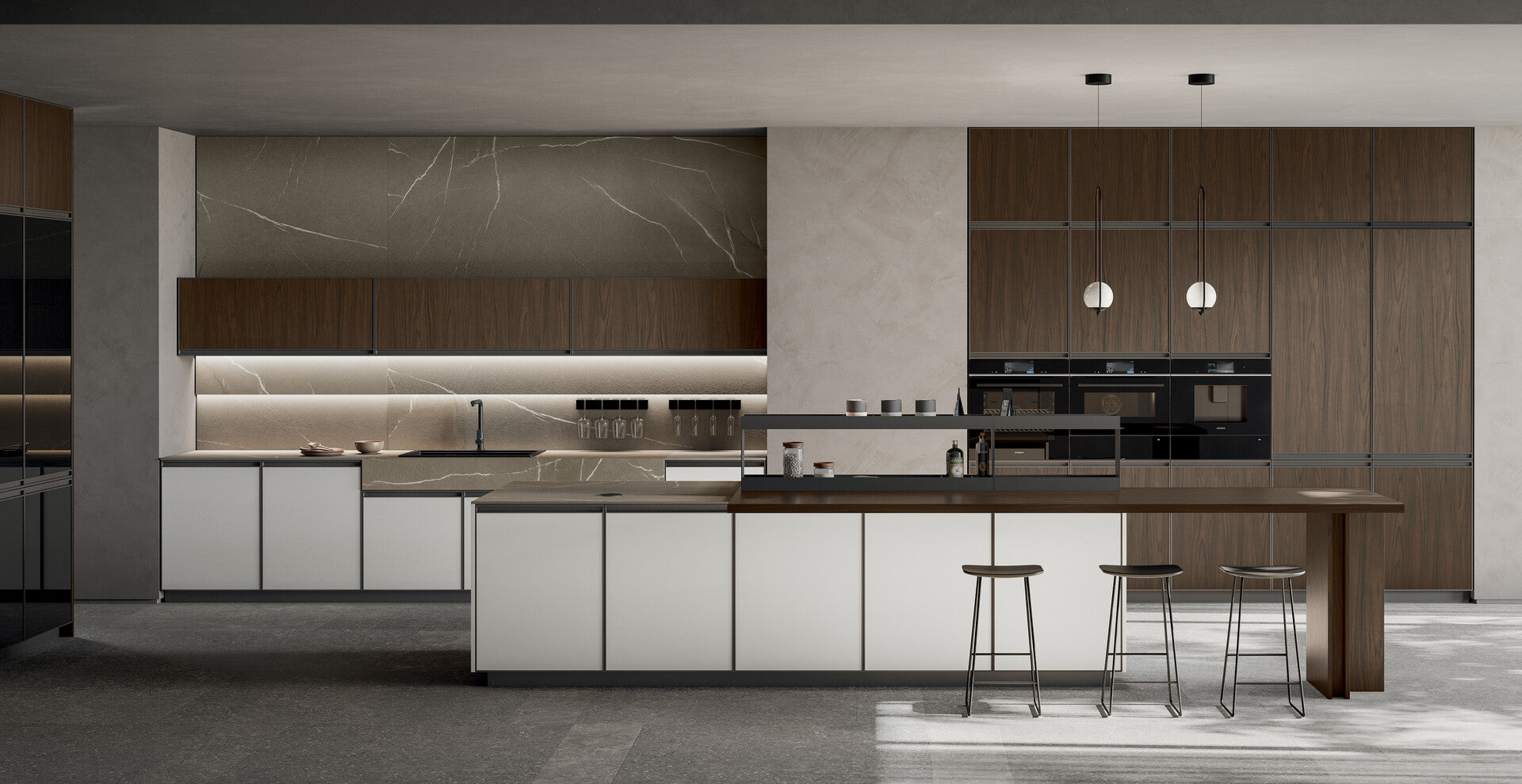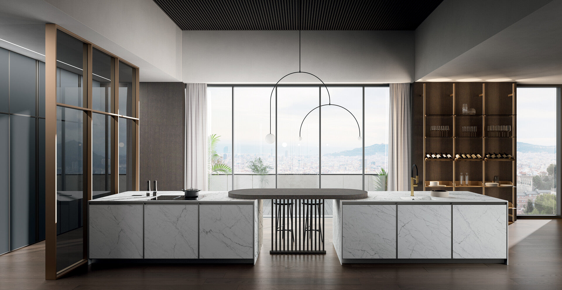 For the Kronos door front, you can range from PVC-free PET to modern and resistant laminates with neutral or wood finishes, to their evolution in stratified HPL, layers of cellulose fibers compact and resistant thanks to a high-pressure process, which become Fenix®; laminated with a final sheet of Fenix®. It is a material with unique technical performance: it resists scratches, abrasions, dry heat and regenerates it from surface micro-scratches. Then there are the eco-sustainable and elegant materials of the Gaia set-up. The veneered beams are made up of 100% post-consumer recycled beams, the opaque glass is 100% recyclable, the opaque Laminam is made up of thin pre-consumer recycled ceramic slabs, obtained with sustainable production.